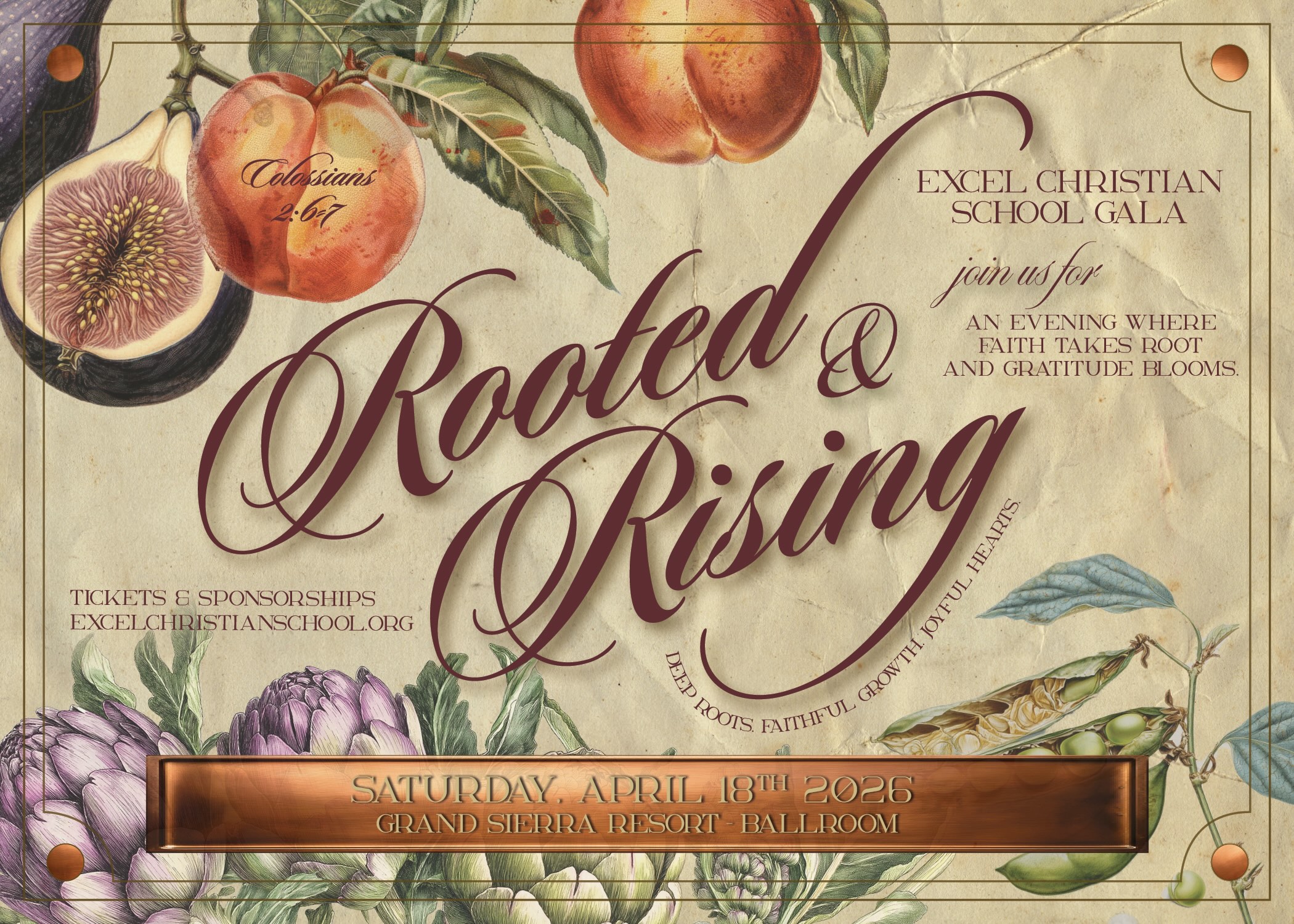 The Rooted & Rising Gala invites guests into an elegant, garden-inspired evening that celebrates the growth and flourishing of Excel Christian School. Surrounded by imagery of deep roots, tender shoots, and abundant harvest, guests will enjoy a beautifully prepared dinner, uplifting stories from students and teachers, and opportunities to support programs that nurture academic excellence and spiritual formation. The gala is both a meaningful fundraiser and a joyful celebration of the strong, connected community that makes Excel thrive. Together, we honor a school rooted in Christ, cultivating student gifts, and rising confidently into the future with good fruit.